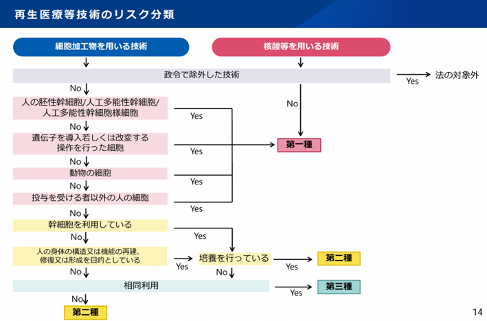 第一種には主に研究分野が含まれ、クリニックで導入される可能性のある再生療法の多くは第二種または第三種に分類されます。