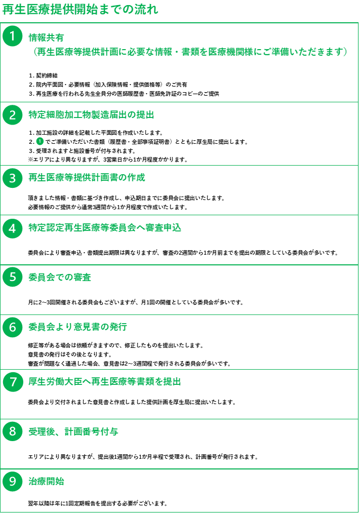 PRP治療や幹細胞治療の導入に向けた再生医療等の申請手続きの大まかな流れは以下のようになります。